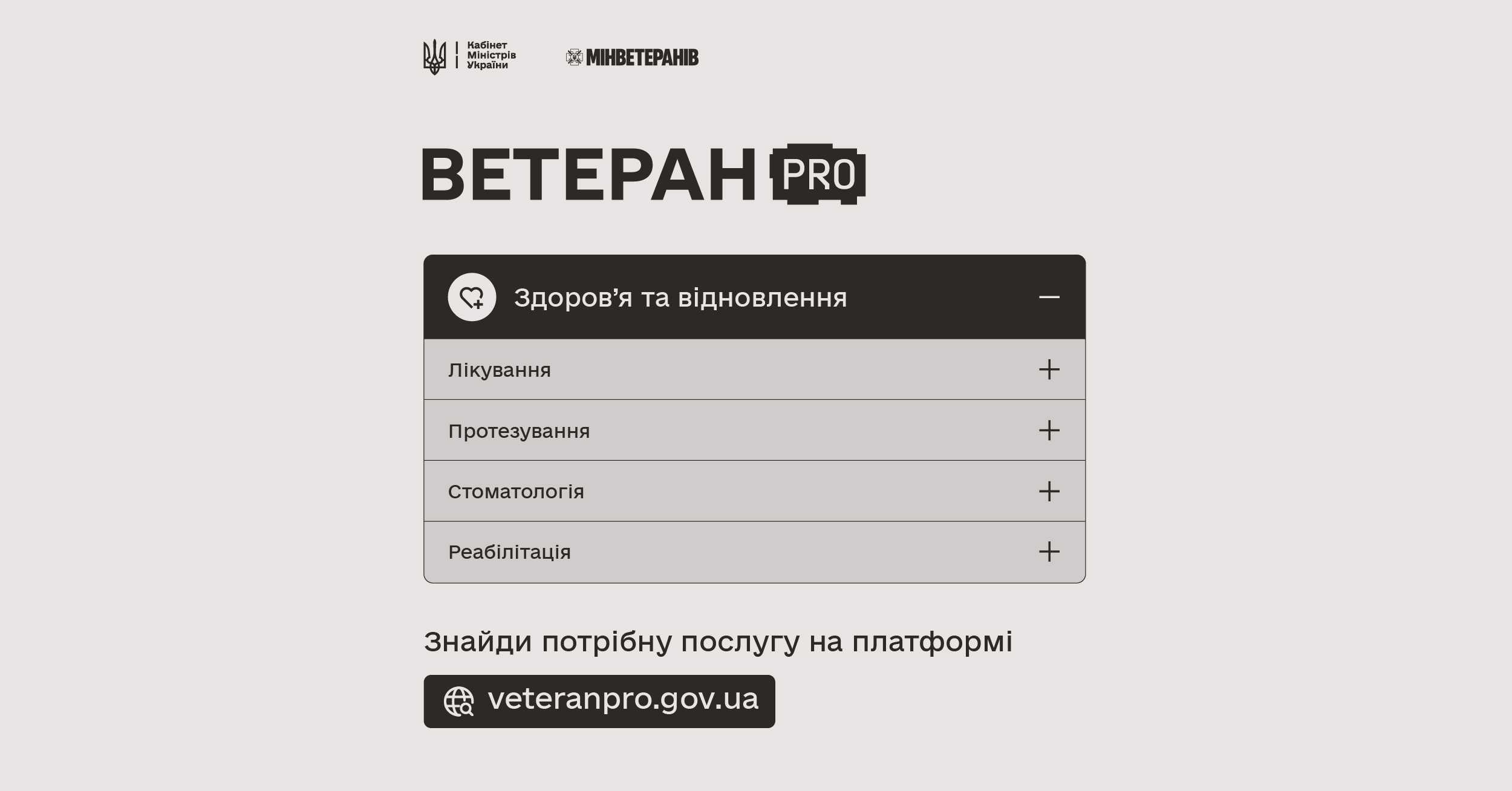 - На платформі Ветеран Pro зібрана перевірена інформація про державні сервіси: лікування й реабілітацію, фінансову підтримку, пільги, навчання, перекваліфікацію, можливості для роботи чи власної справи, а також про більше послуг.